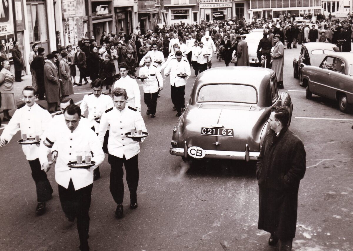 Formaat : 13 x 18 cm. - De deelnemende kelners in de Kursaal-Oosthelling. Op de achtergrond de Van Iseghemlaan en het Monacoplein (rechts). Op de voorgrond een auto met een koloniale nummerplaat (CB = Congo Belge).