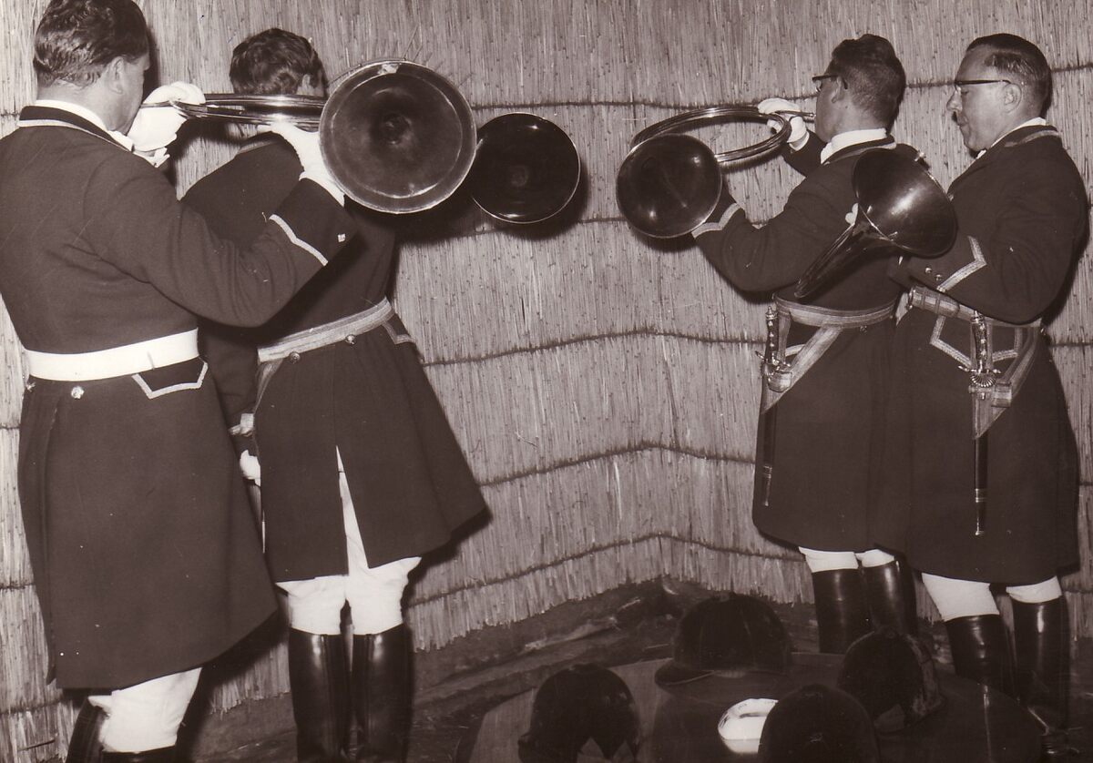 (Jacht)Hoornblazers op een ruiterfeest in het sportcentrum (Noorse stallingen) aan de Koninginnelaan.