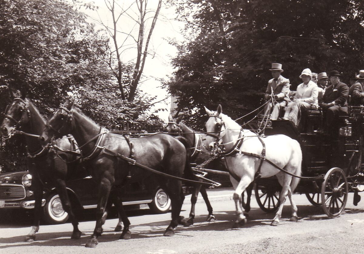 Een koets (vierspan) in de Koninginnelaan tijdens een ruiterfeest in het aldaar liggend sportcentrum.