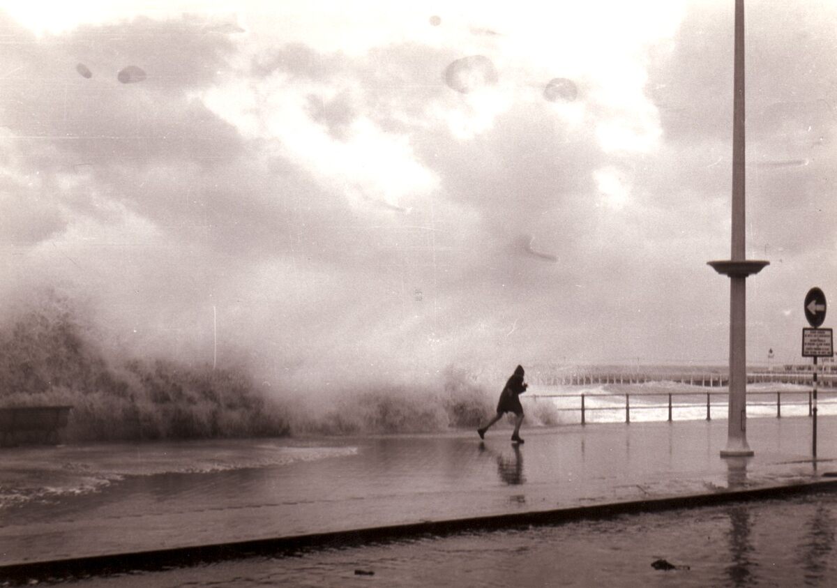 Een jongen tracht een nat pak te ontlopen tijdens stormweer aan de Albert I Promenade.
