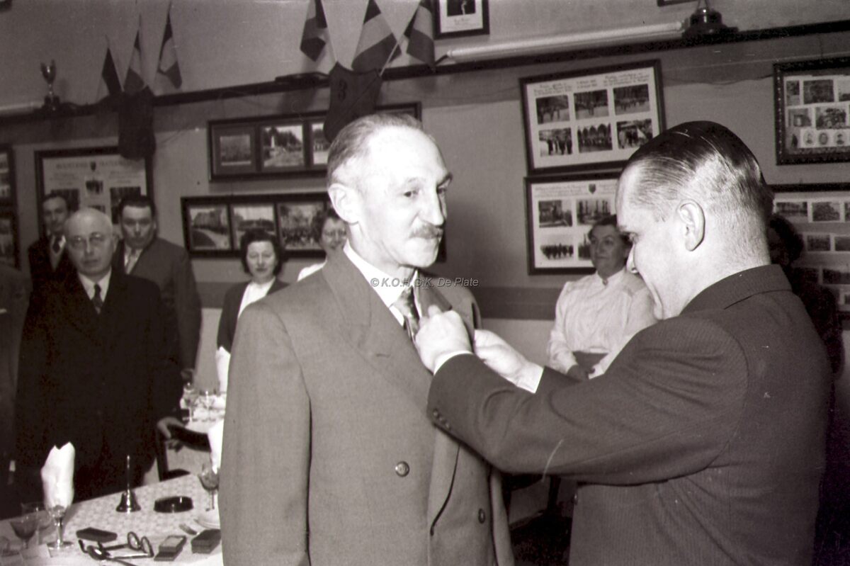 Burgemeester Adolf VAN GLABBEKE vereremerkt een oudstrijder tijdens een banket bij de oud onderofficieren.