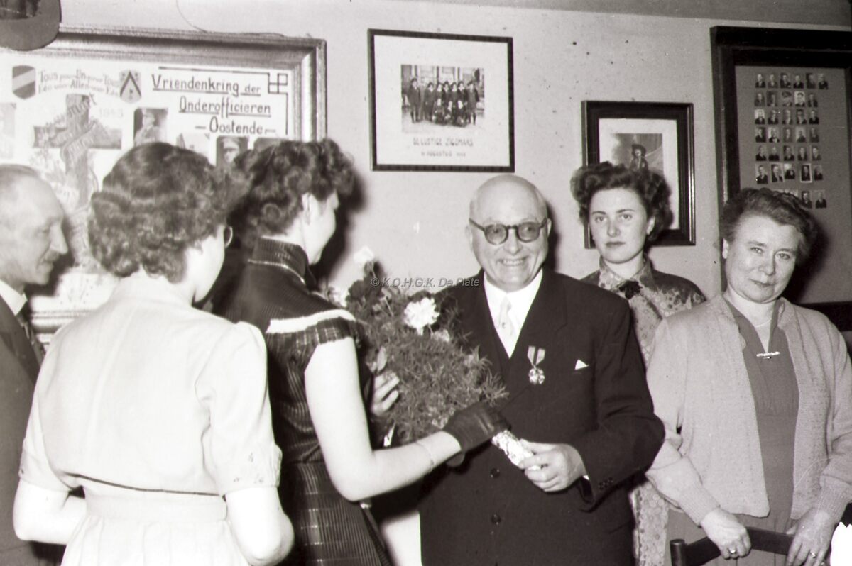 Een zonet gedecoreerde oudstrijder wordt in de bloemetjes gezet op een banket.Zijn echtgenote staat er glunderend bij.