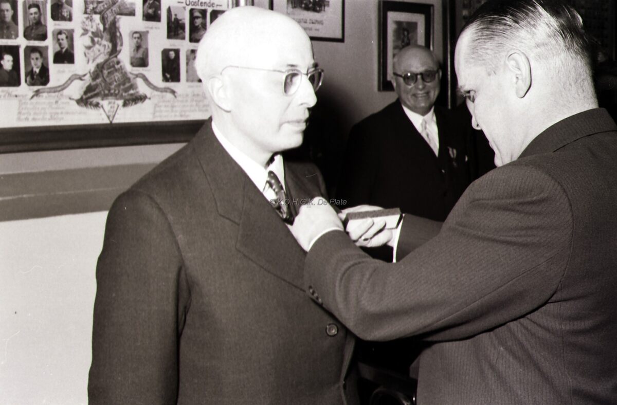 Burgemeester Adolf VAN GLABBEKE decoreert een oudstrijder.