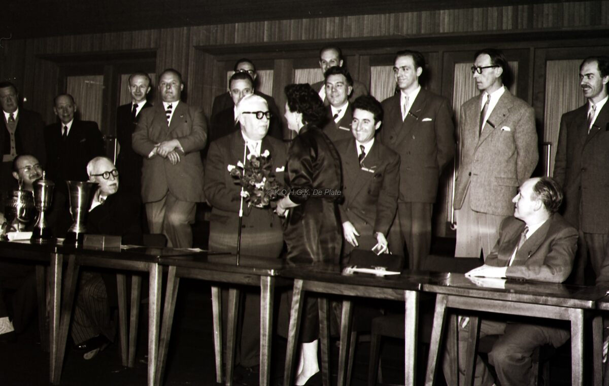 De jury (?) van een kapperswedstrijd.De voorzitter wordt in de bloemetjes gezet.