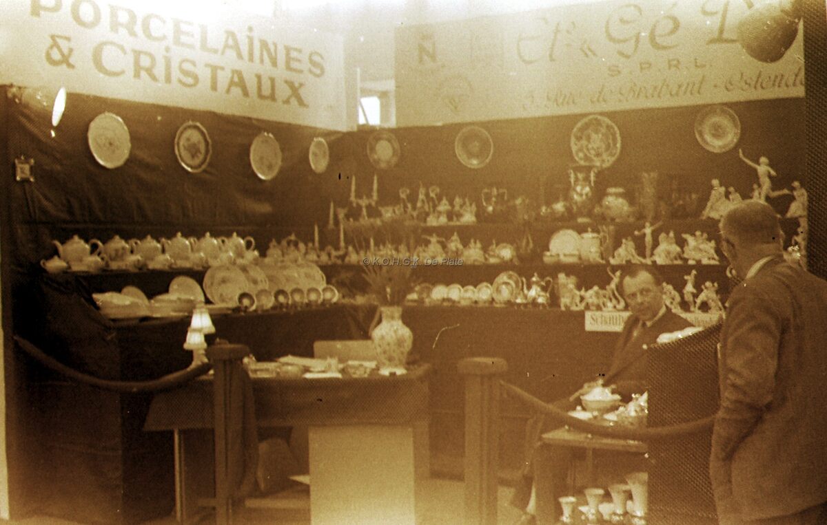 Stand van de handelszaak "Ets. GéDé, Brabantstraat 5 Oostende, op de handelsbeurs 1954 te Brussel. Opschrift : Porcelaines & Cristaux