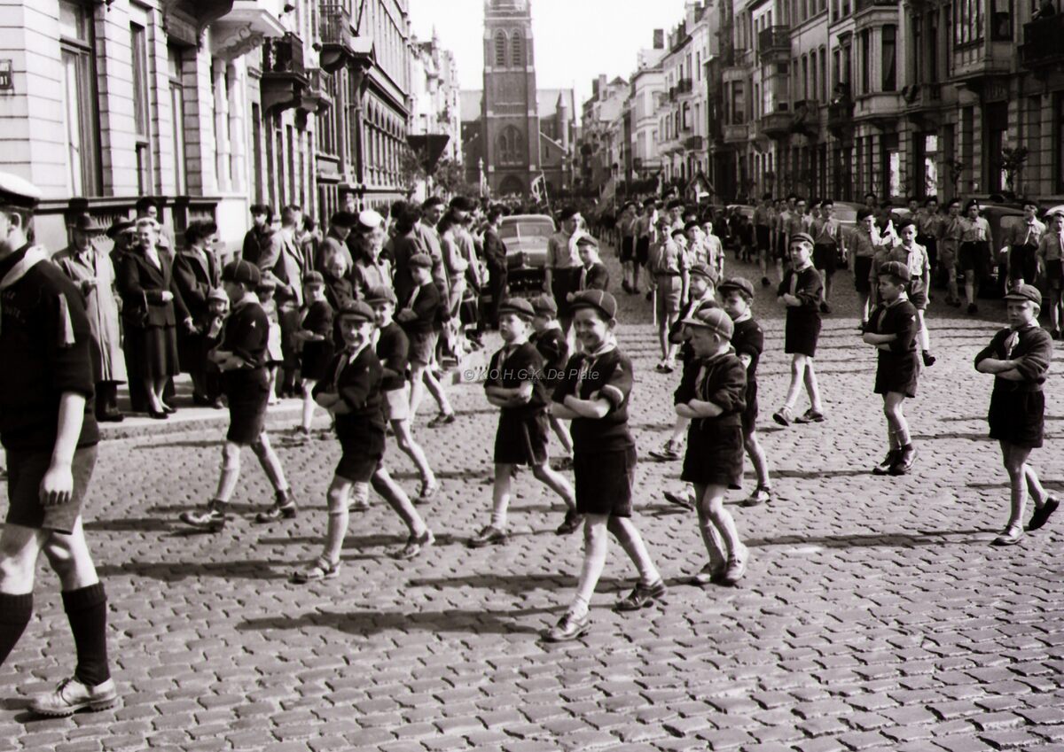 Een groep scouts uit de Maria ^processie komt uit de Rogierlaan op het Leopold I plein. Links de kostschool van het Atheneum.