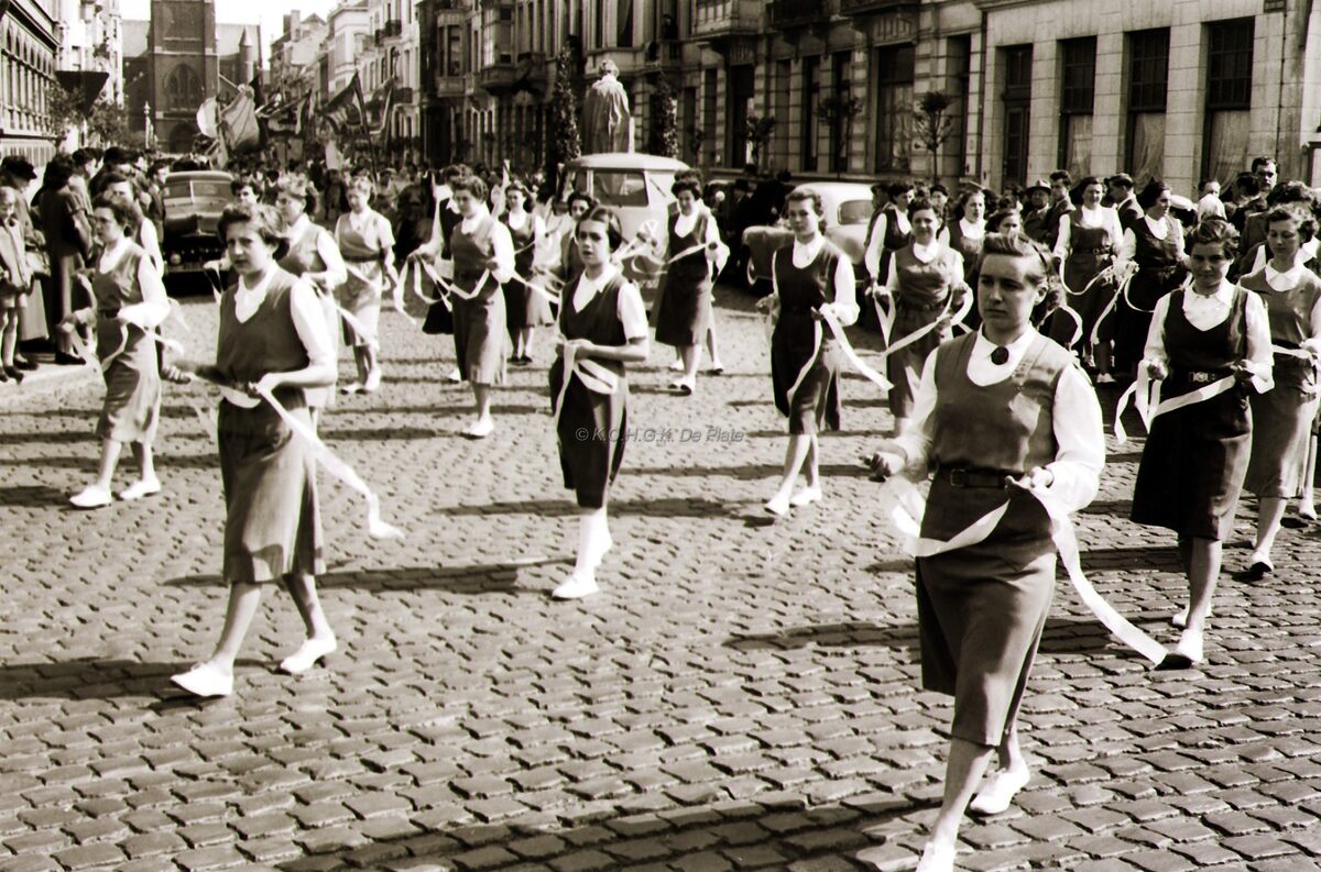 Een groep meisjes uit de Maria processie komt uit de Rogierlaan op het Leopold I plein.