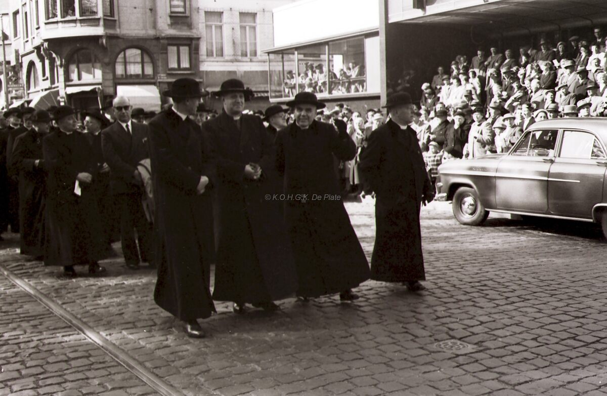 De kerkelijke en andere notabelen uit de Maria processie aan het postgebouw in de Hendrik Serruyslaan.