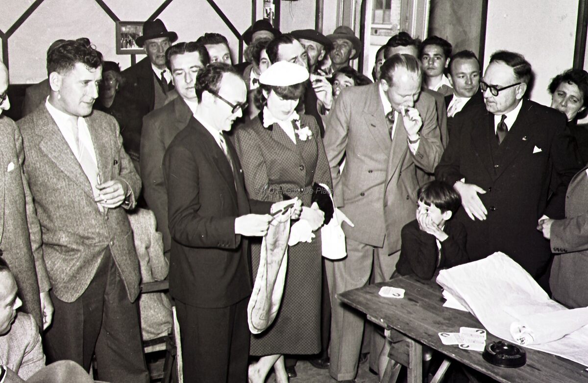 Een groep deelnemers aan een schaaktornooi op Sas Slijkens bij de prijzentafel.