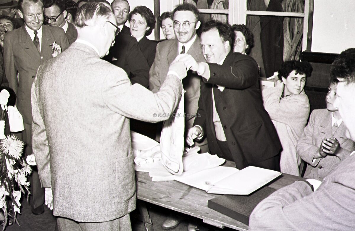 Burgemeester August PLOVIE van Bredene overhandigt een prijs na afloop van een schaaktornooi op Sas Slijkens.