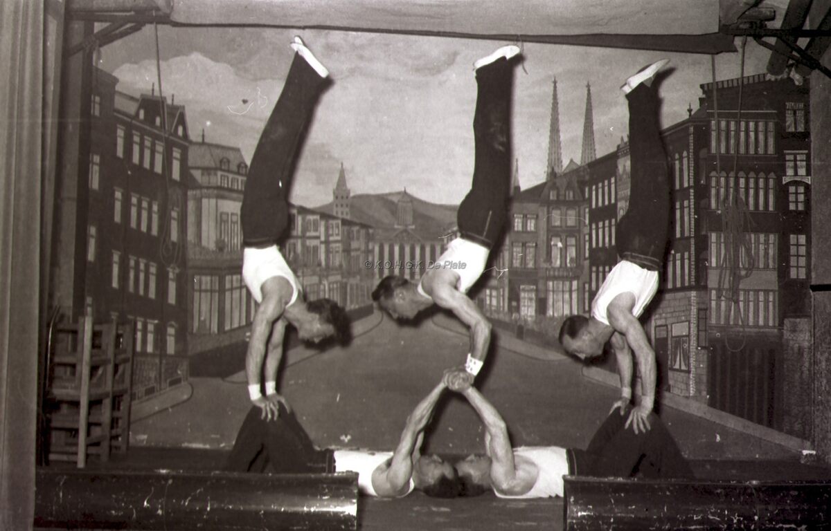 Optreden van een turnvereniging in een theaterzaaltje te Bredene (?).