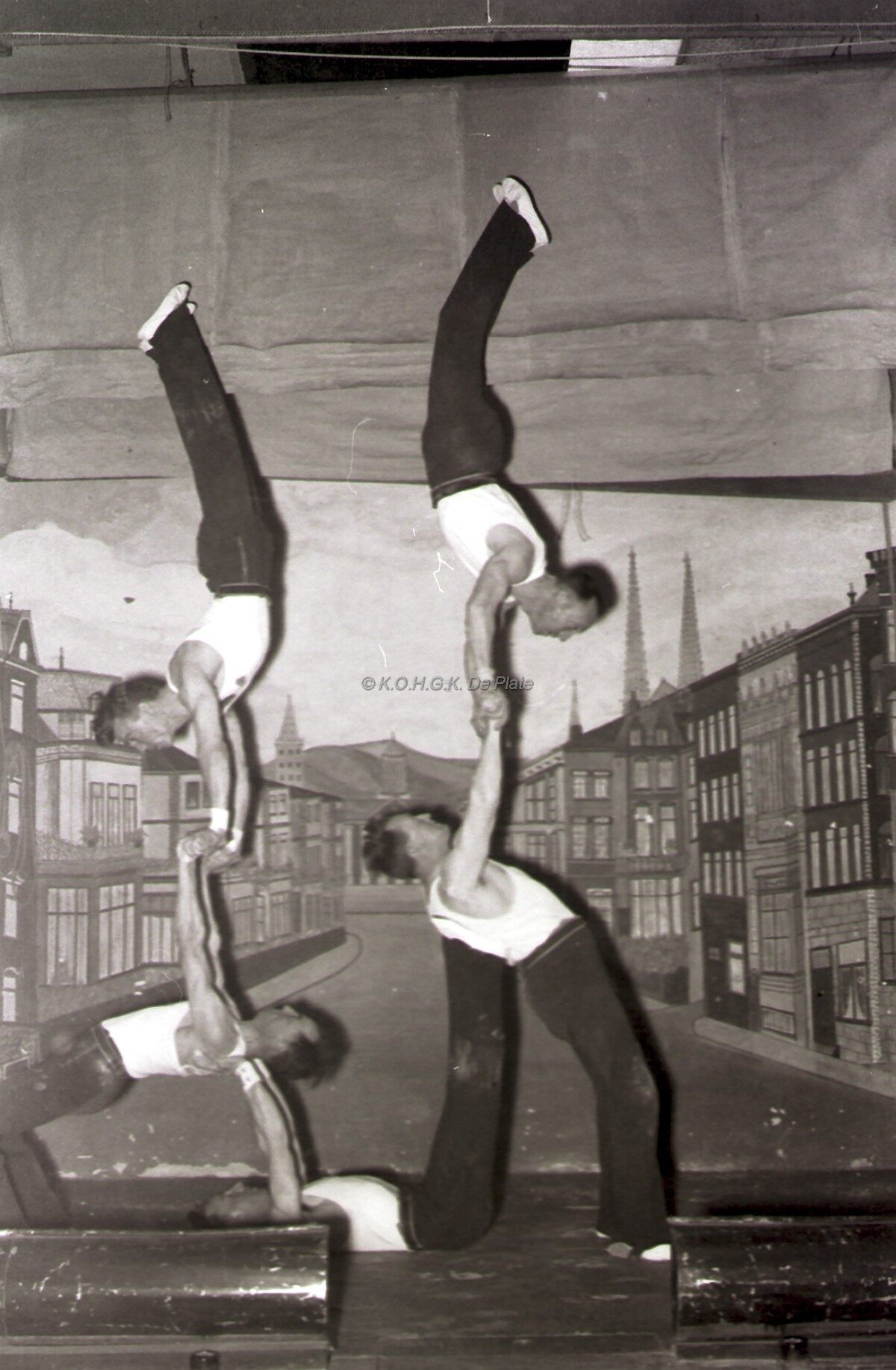 Een turnvereniging treedt op in een Bredens (?) theaterzaaltje.