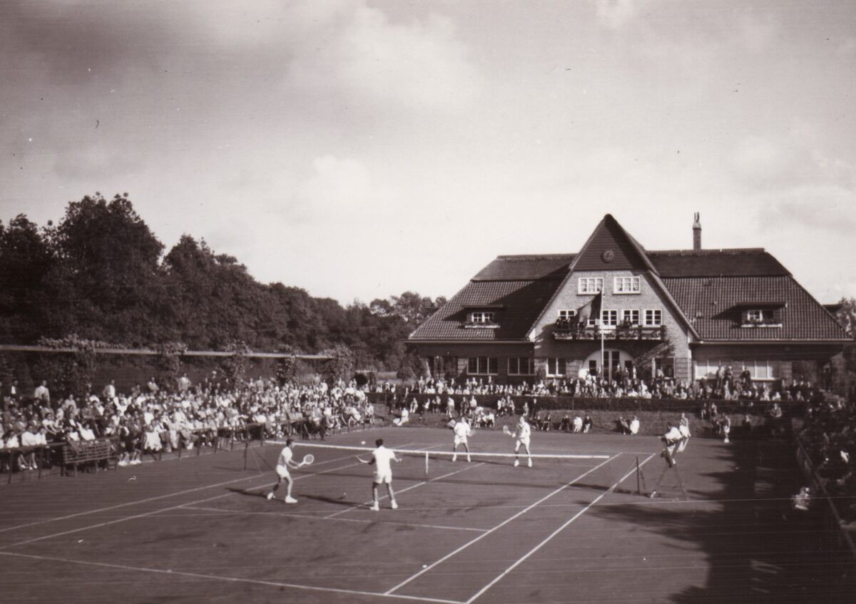 Formaat : 13 x 18 cm. - Een tenniswedstrijd dubbelspel mannen op Ostend Tennis aan de Koninginnelaan (links).