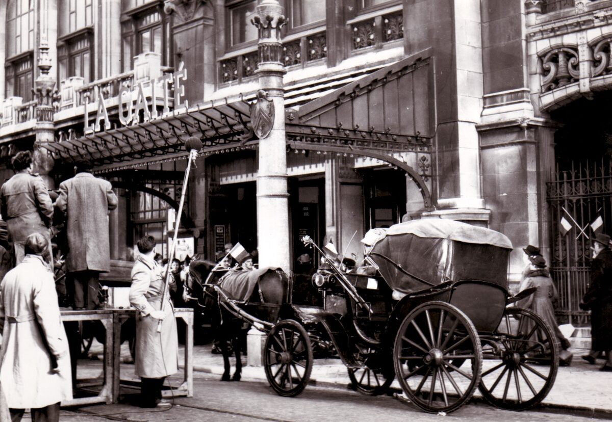 Opname voor een film aan de Koninklijke Schouwburg in de Van Iseghemlaan. Een van de rekwisieten is een open koets of calèche.
