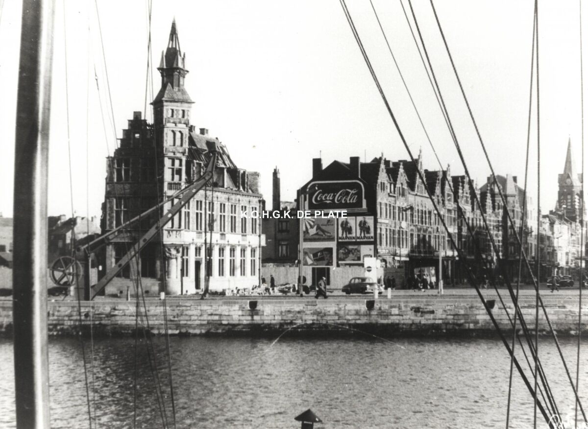 Formaat : 18 x 24 cm. - Links het politiebureau op het Ernest Feysplein en helemaal rechts de Hazegraskerk