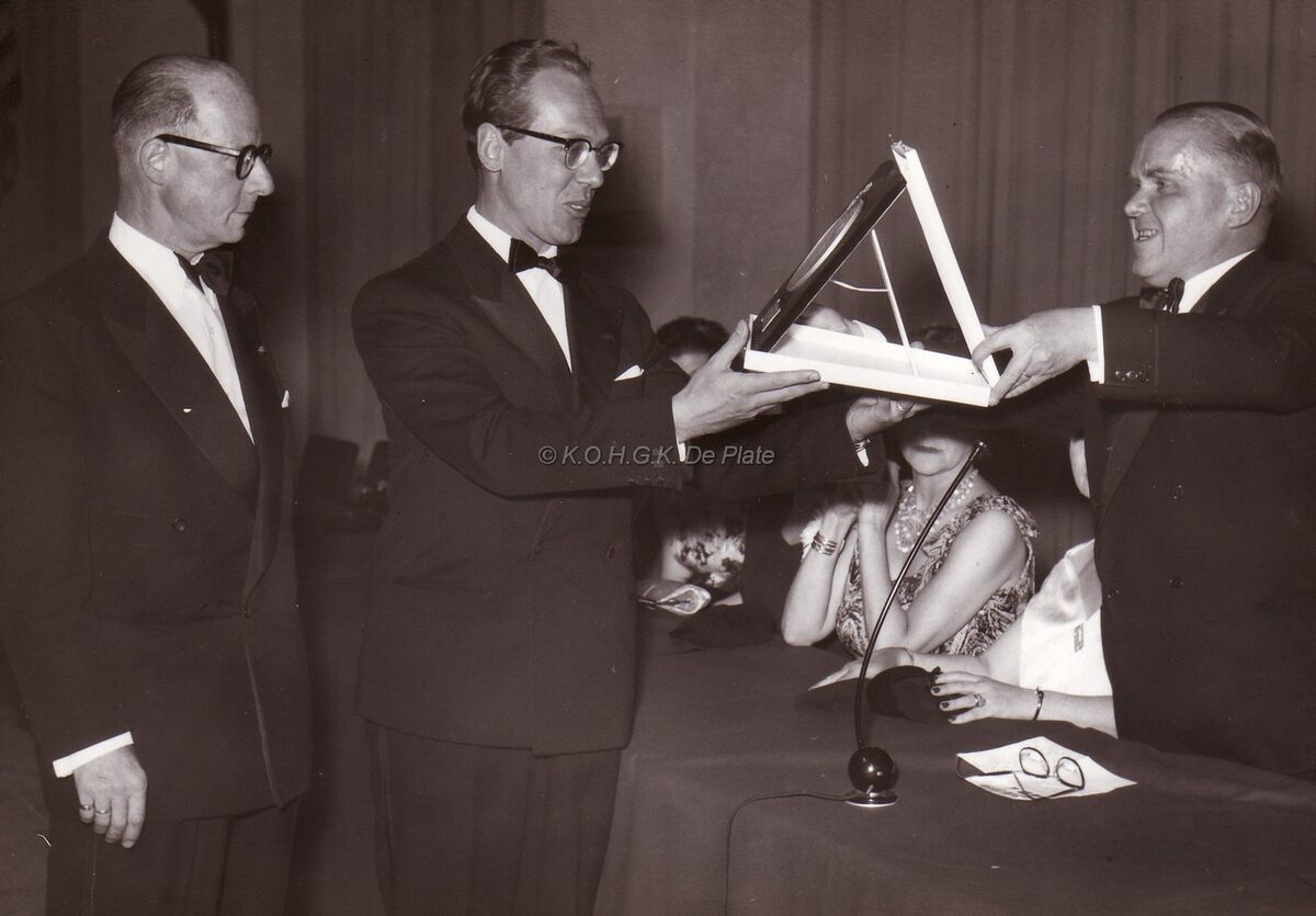 Burgemeester Adolf Van Glabbeke reikt de Belgische Feminaprijs van de Film 1956 uit aan een winnaar.