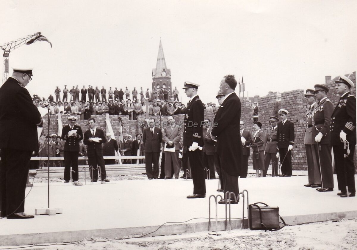 Prins Albert op de bouwwerf van een nieuwe blok in de Bootsman Jonsenkazerne (de ontmijningsschool ?).Op de achtergrond de toren van de nu verdwenen Hazegraskerk.