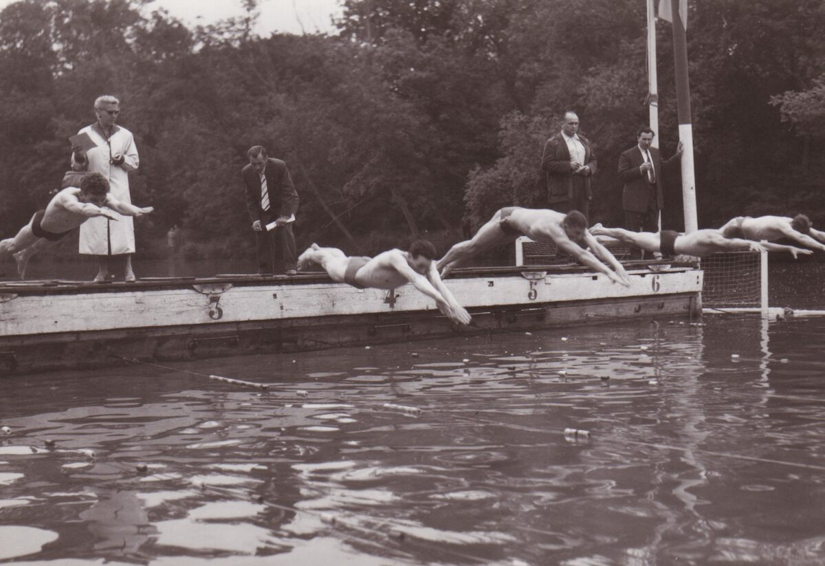 De start van een wedstrijd 200 meter heren bij zwemclub R.O.S.C. in het Maria-Hendrikapark nabij het Koninginnehof.