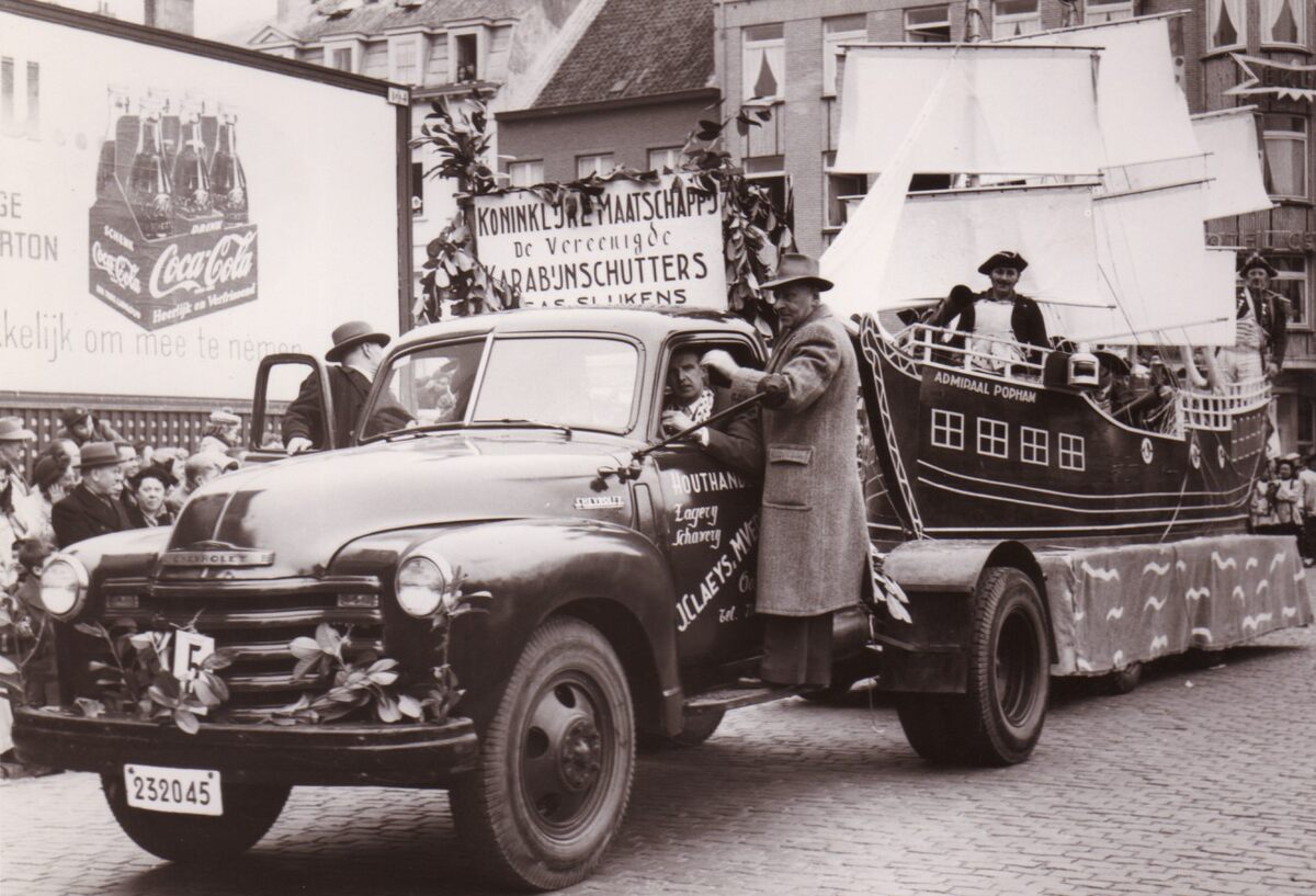 Een vrachtwagen van houthandel J.C. Claeys met praalwagen admiraalschip "Popham" bemand door leden van de "Koninklijke Maatschappij de Vereenigde Karabijnschutters" uit Bredene op het Wapenplein. Popham was een Brits genearaal die een raid uitvoerde op de sluizen te Bredene tijdens de Franse bezetting.