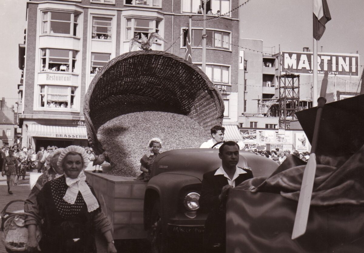 Een praalwagen met een "benne" (=mand) garnaal in een stoet op het Wapenplein.Op de achtergrond links de Brabantstraat.