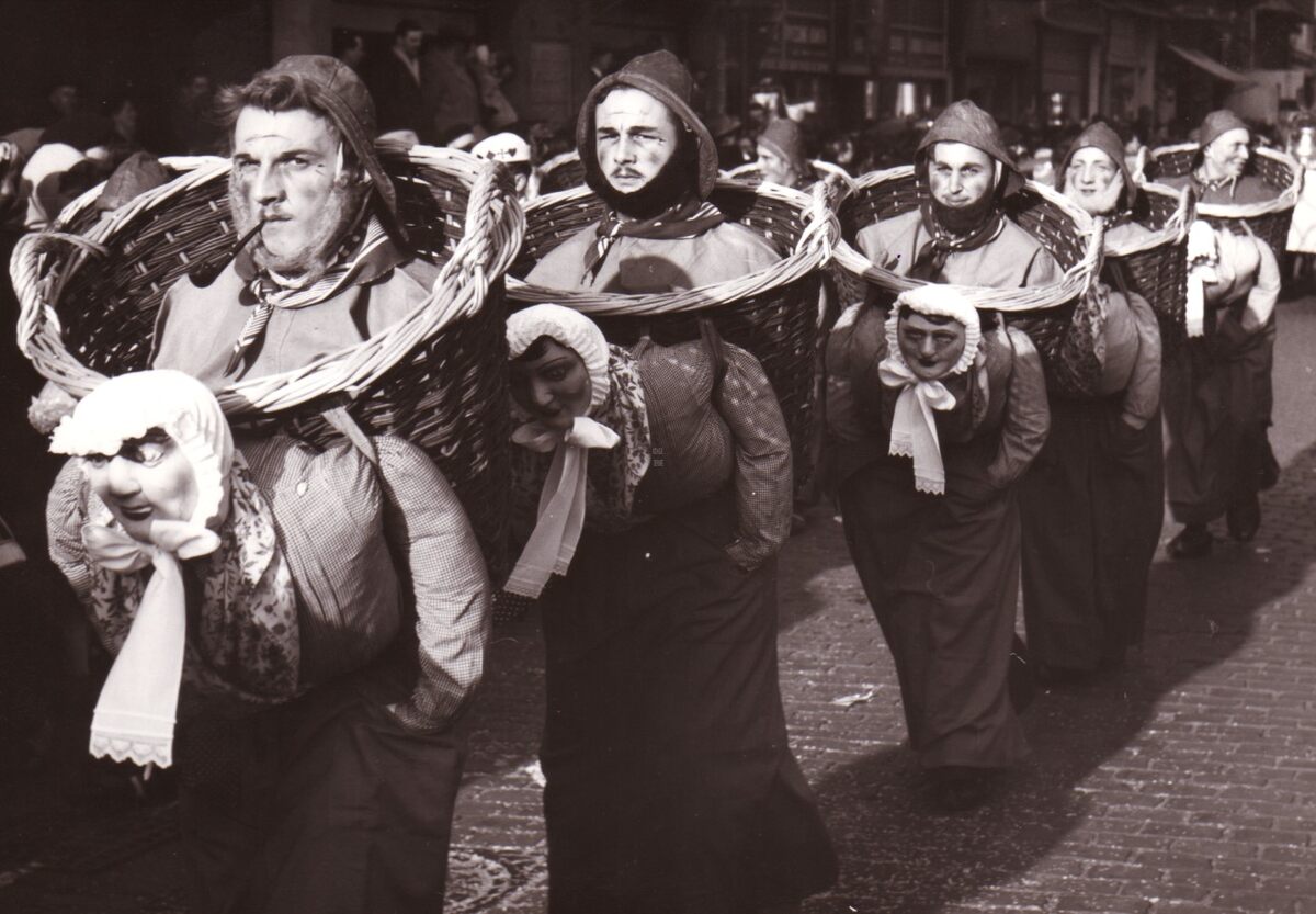 Een groep vissers (op de rug van hun vrouw) in een carnavalstoet.