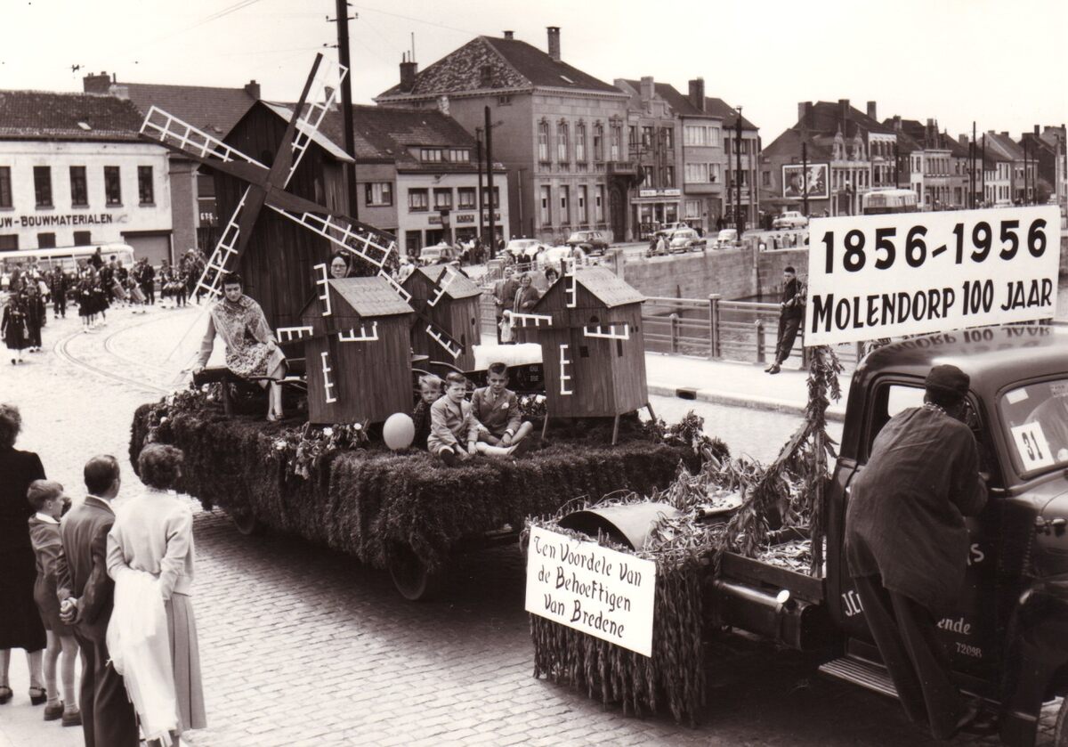 Een praalwagen in een stoet te Bredene aan de Prins Albertlaan ter gelegenheid van 100 jaar Molendorp.