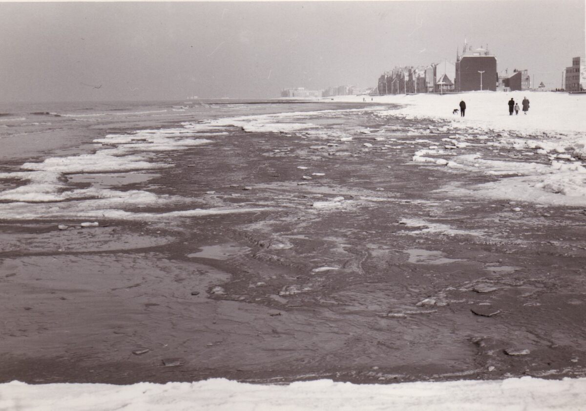 Het strand en de dijk te Mariakerke onder sneeuwen ijs bij laag water.Het gebouwmet de zwarte zijgevel stond op de hoek met de Northlaan.
