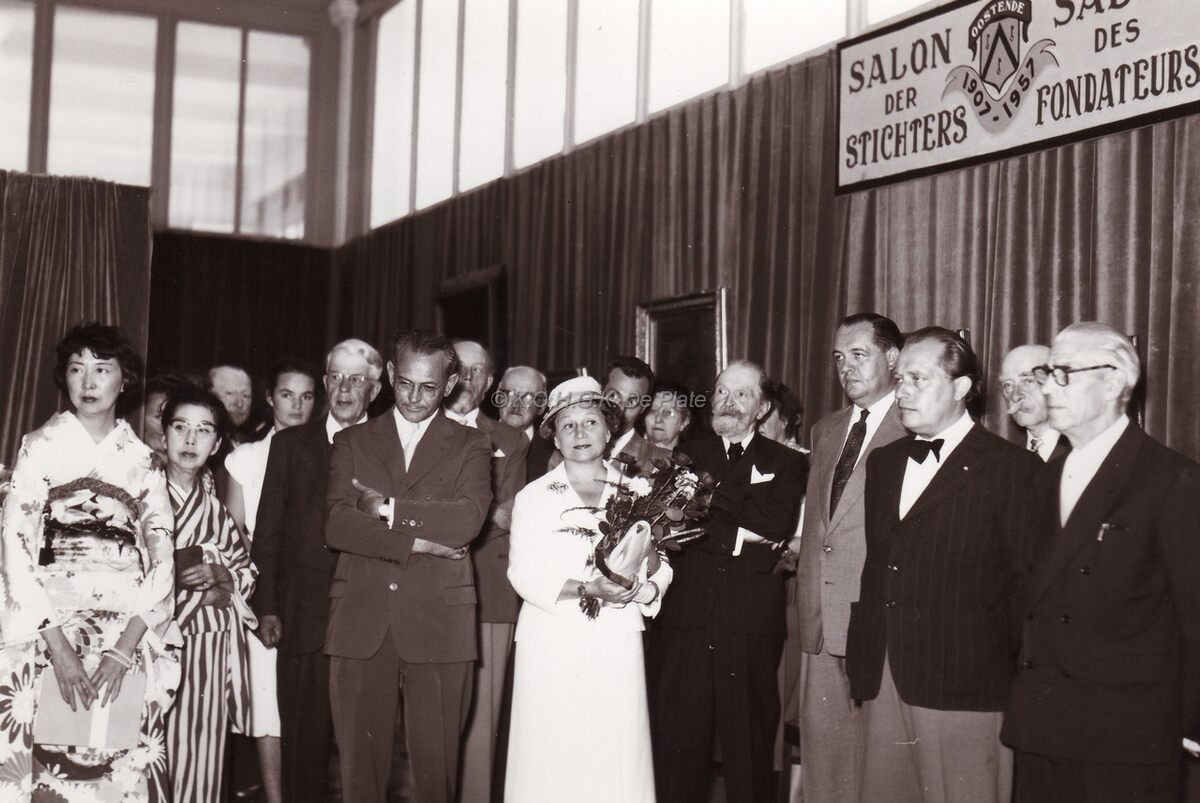 Opening tentoonstelling van "Het Salon van de Oostendse Kunstkring" in de Koninklijke Gaanderijen. Centraal in het wit mevrouw Adolf VAN GLABBEKE (mevrouw MULLIE). Naast haar links, schepen Frans VAN CAILLIE, en rechts, kunstschilder Jan DE CLERCK, met baard. Er was ook een japanse afvaardiging. Derde vanaf rechts, met vlinderdas, kunstschilder Albert HAGERS. Op het bord achter hen "Salon der stichters, Salon des fondateurs en het wapenschild van de stad Oostende 1907-1957".