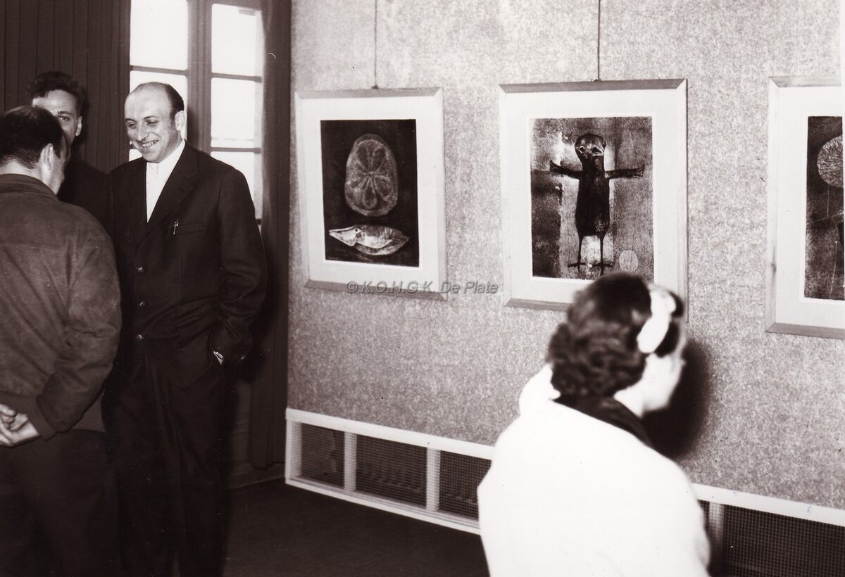 Formaat : 13 x 18 cm. - De kunstenaar in gesprek. Het Museum voor Schone Kunsten, toen gevestigd in de Koninklijke Schouwburg (Van Iseghemlaan). Tentoonstelling ingericht door de kunstkring "Mozaïek"
