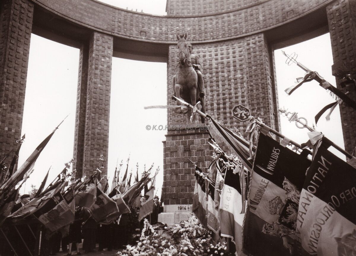 De vlaggen van de oudstrijdersverenigingen groeten tijdens een vaderlandse plechtigheid aan het monument van Albert I te Nieuwpoort.