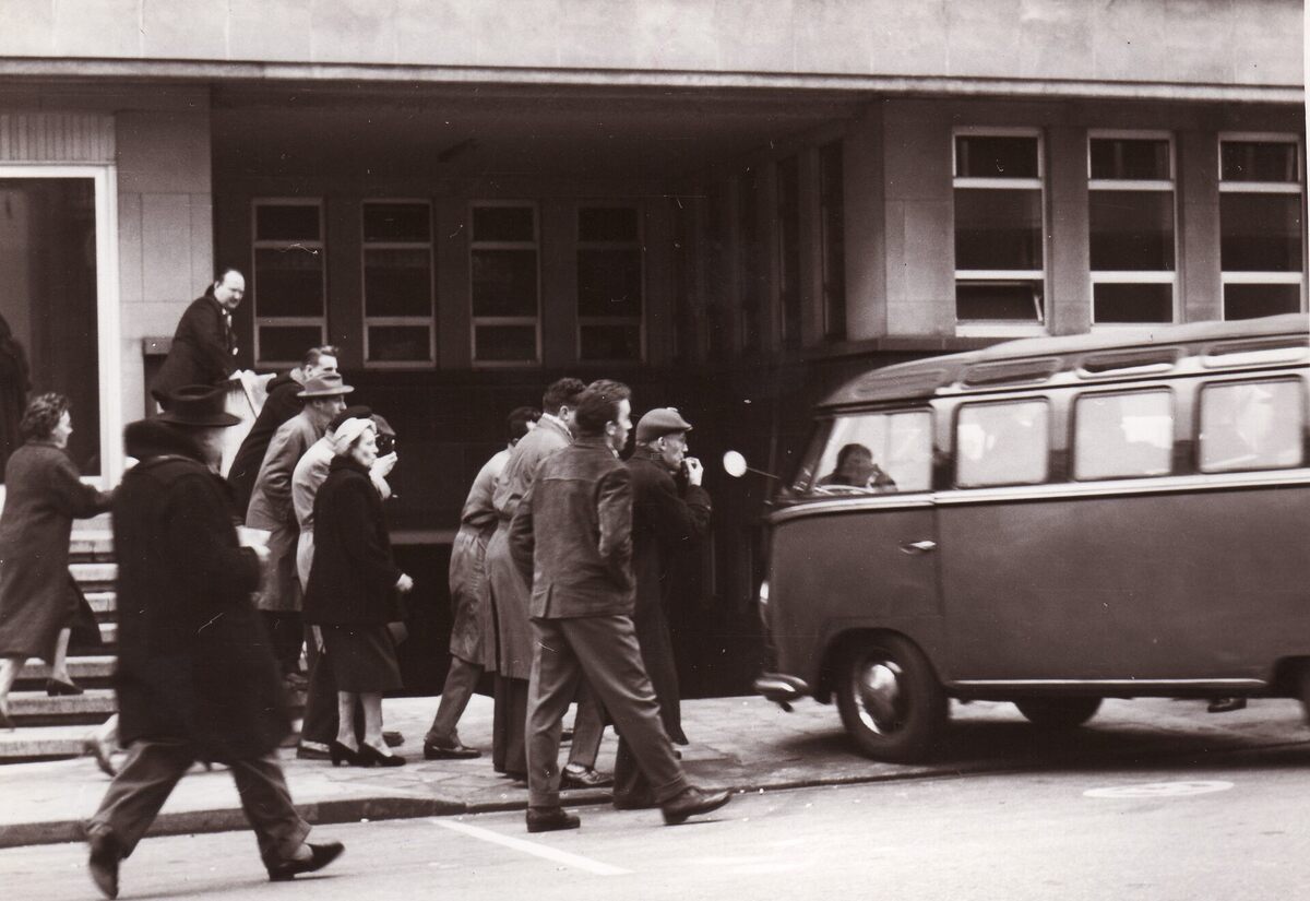 Formaat : 13 x18 cm. - Stakende spelbedienden op de Kursaal-Oosthelling jouwen werkwilligen uit die het Casino-Kursaal binnenrijden. Links boven op de trap, Roger De Ramée, directeur van het Casino-Kursaal.