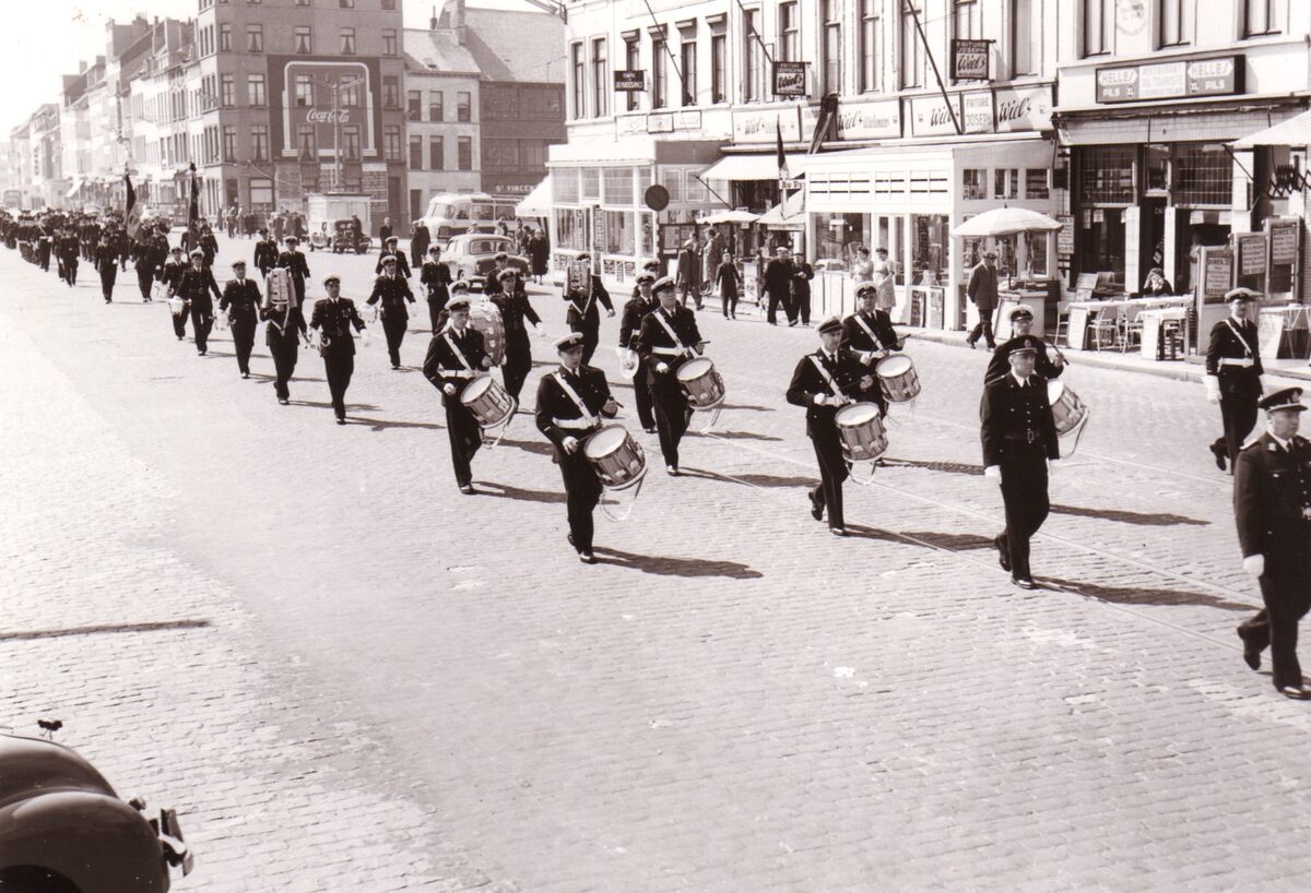 Het muziekkorps van de stedelijke politie opent de optocht tijdens de dag der politie op de Visserskaai.