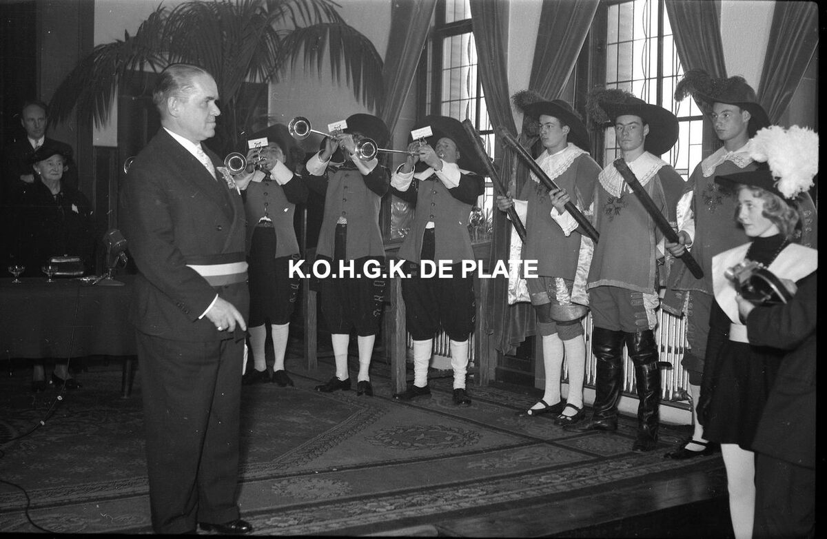 Negatief : 6 x 9 cm. - Plechtige ontvangst op het dienstdoend stadhuis (gerechtshof). Vooraan, burgemeester Adolf Van Glabbeke.