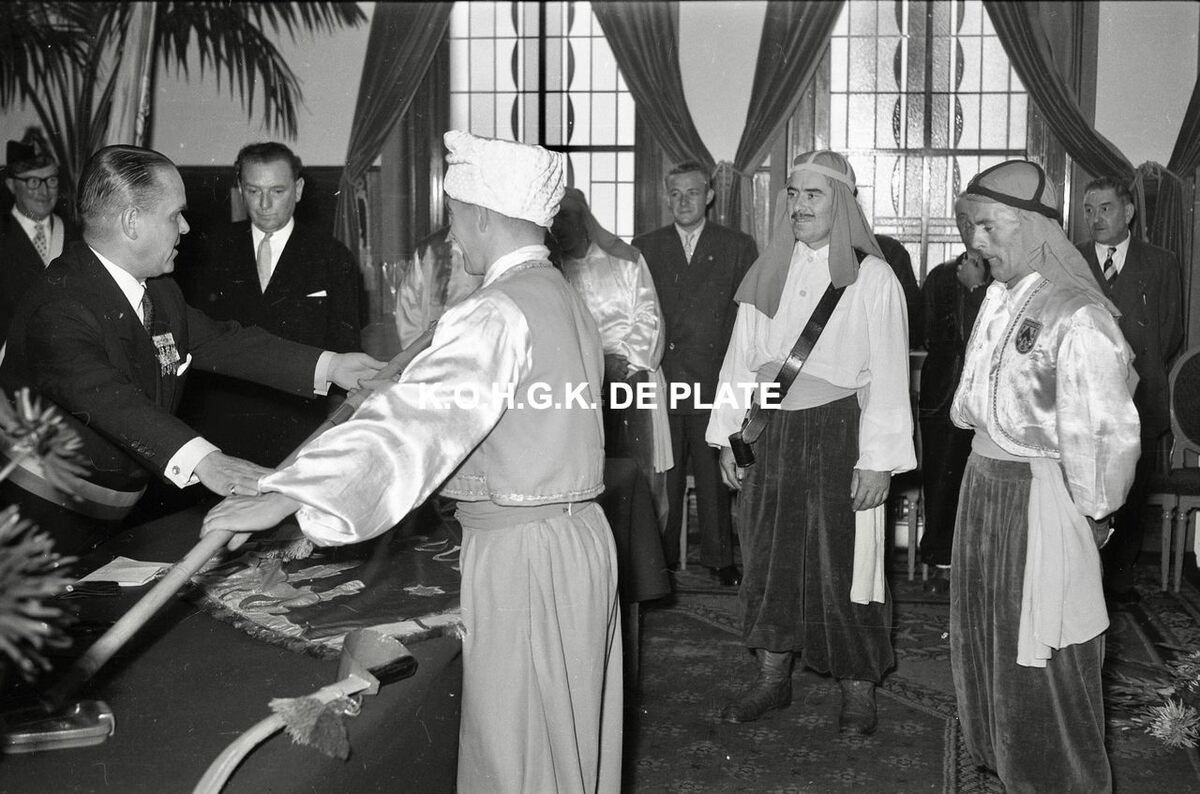 Negatief : 6 x 9 cm. - Burgemeester Adolf Van Glabbeke overhandigt de nieuwe vlag aan Ali Baba tijdens een plechtigheid in het dienstdoend stadhuis (Gerechtshof). Tussen hen, feestbestuurder Aloïs Dennekin