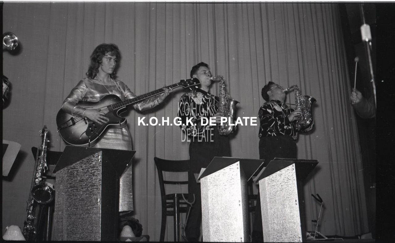 Negatief : 6 x 9 cm. - Links, de echtgenote van Louis Fiers, Jacqueline Saury (elektrische basgitaar)
