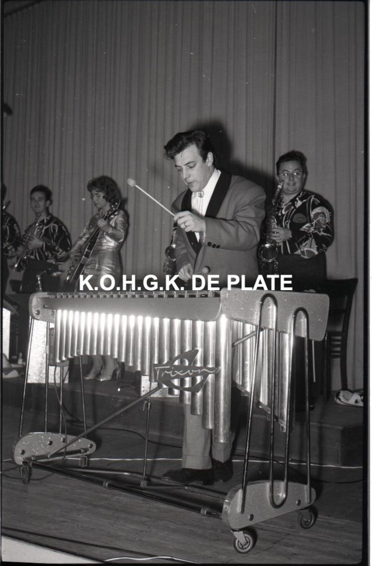 Negatief : 6 x 9 cm. - Louis Fiers (vibrafoon) en links, zijn echtgenote Jacqueline Saury (elektrische basgitaar)