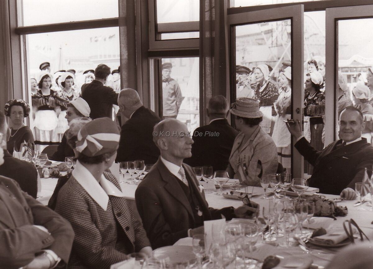 Het banket. Rechts, burgemeester Adolf Van Glabbeke. Centraal, schepen Marie-Jozef Porta. Buiten zingt het koor "Het Loze Vissertje"