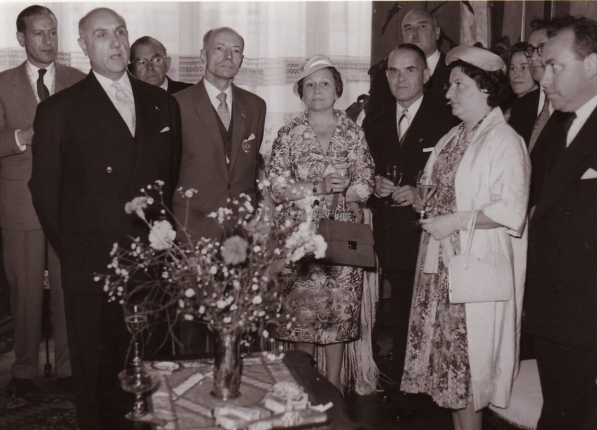 Ontvangst ten huize Porta, naar aanleiding van de jumelage Oostende-Monaco wordt een toespraak gehouden door de heer BOISSON, burgemeester van Monaco.Vierde van links schepen Marie-Jozef PORTA, naast hem mevrouw en burgemeester Adolf VAN GLABBEKE,achter de burgemeester, schepen Maurice QUAGHEBEUR en uiterst rechts Henri DEGRAVE, met naast hem met bril Jan FELIX