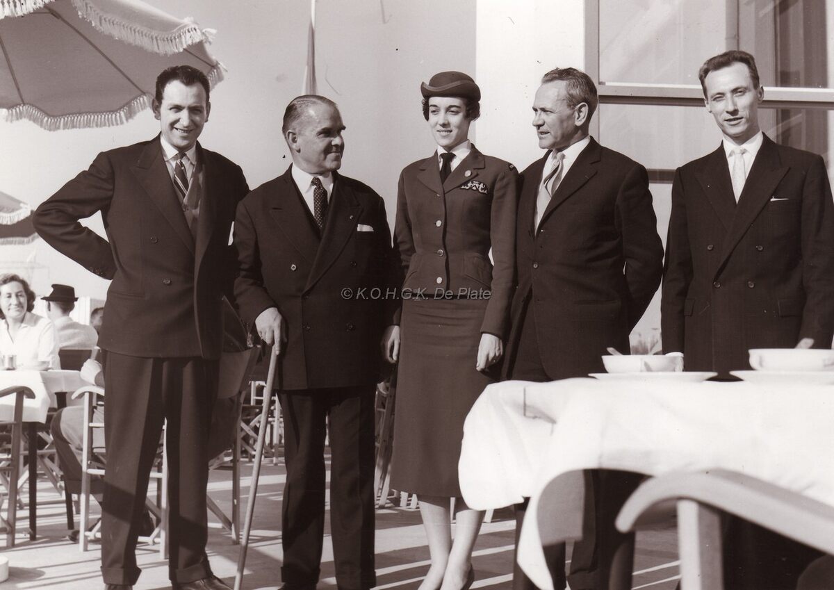 Burgemeester Adolf Van Glabbeke in het gezelschap van de Oostendse fairhostess Edith Leniere aan het paviljoen van Oostende. Rechts van de hostess, schepen Frans Van Caillie en Alred Rigaux, hoofd dienst toerisme.