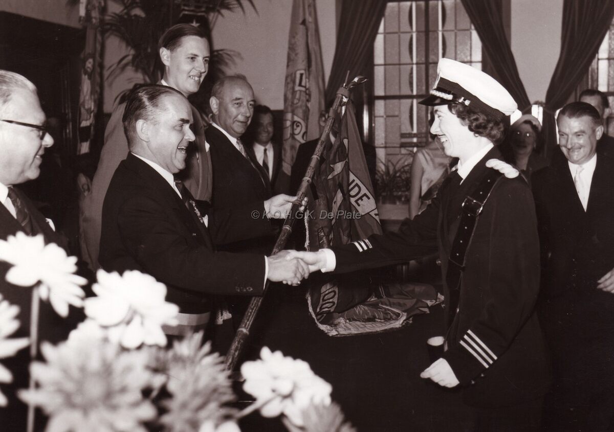 Burgemeester Adolf Van Glabbeke bij de overhandiging in het dienstdoend stadhuis (huidig gerechtshof) van het vaandel aan de Oostendse folklore vereniging "De Oude Ijslandvaarders". Schepenen Jan Piers en Kamiel Dehouck kijken toe.