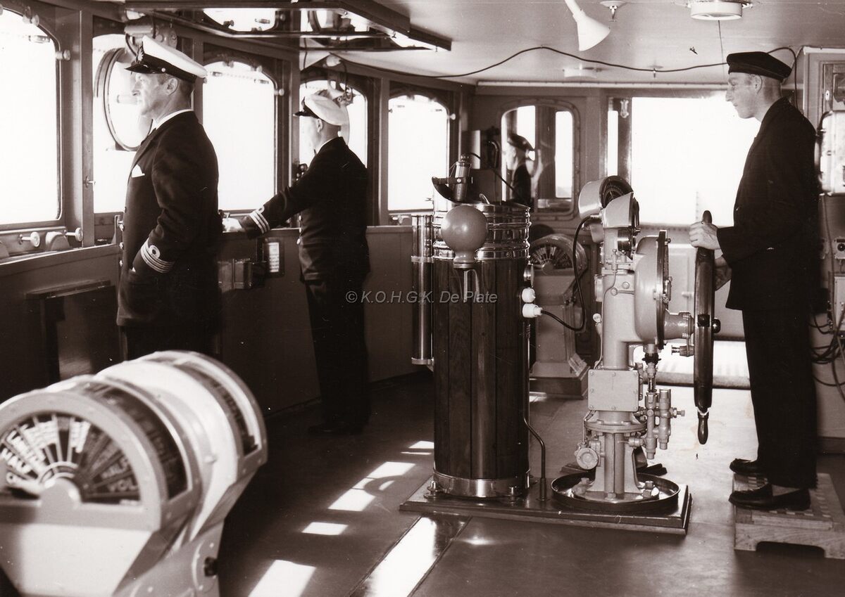 De brug van de Artevelde. Vooraan links staat commandant Spoelders. Links vooraan de telegraaf en in het midden het magnetisch standaardkompas