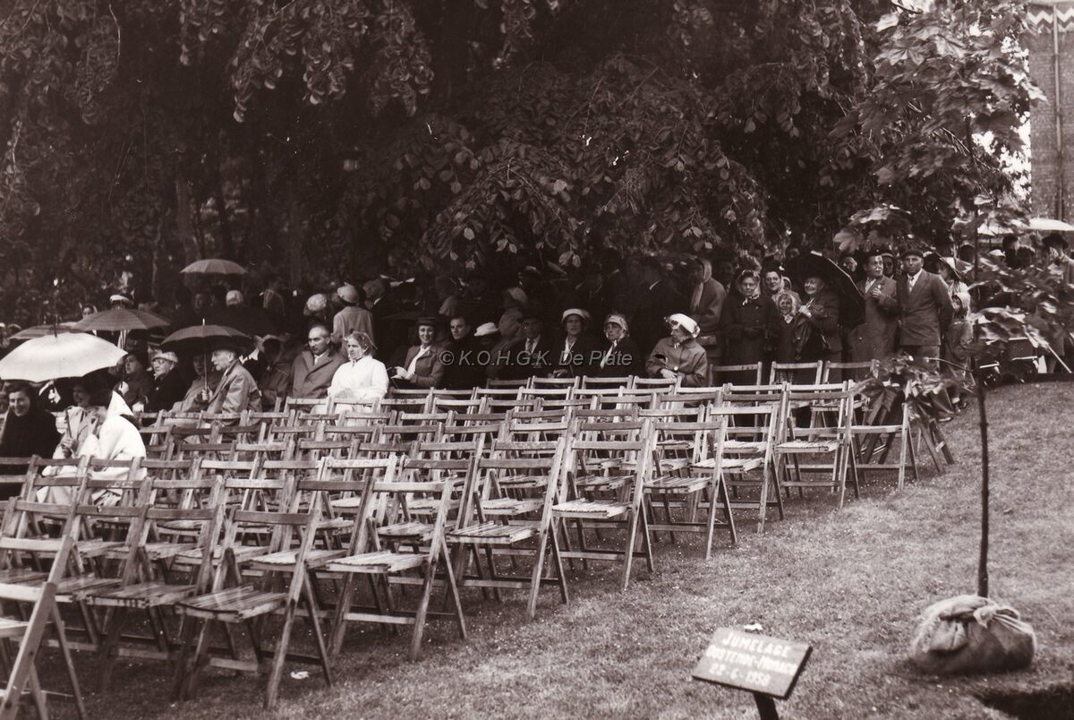 Een groep genodigden in het Leopoldpark (?) tijdens de jumelagefeesten Oostende-Monaco.Blijkbaar regent het,de mensen schuilen onder de bomen.