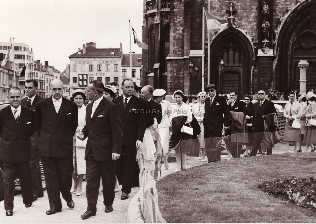 Repetitie voor de plechtigheden van de jumelage Oostende-Monaco (?). Burgemeester Adolf VAN GLABBEKE, met naast hem de heer BOISSON, burgemeester van Monaco en Frans VAN CAILLIE, schepen en andere notabelen hebben zojuist de Sint Petrus en Pauluskerk verlaten. Links de Jozef II straat.