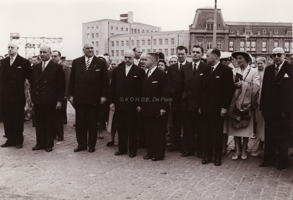 Repetitie voor de plechtigheden van de jumelage Oostende-Monaco.De notabelen voor het monument der gesneuvelden op het Sint-Petrus-en-Paulusplein.Centraal burgemeester Adolf VAN GLABBEKE,de heer BOISSON, burgemeester van Monaco, de schepenen Maurice QUAGHEBEUR en Kamiel DEHOUCK. Uiterst links Michel SURMONT,stadssecretaris.