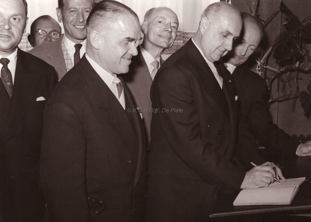 De burgemeester van Monaco, de heer BOISSON, tekent het register naar aanleiding van de jumelage Oostende- Monaco, in de ambtswoning aan de Van Iseghemlaan (huize Monaco) van Marie-Jozef PORTA, consul van Monaco en schepen van Oostende die achter de ondertekenaar staat. Burgemeester Adolf VAN GLABBEKE kijkt glimlachend toe.