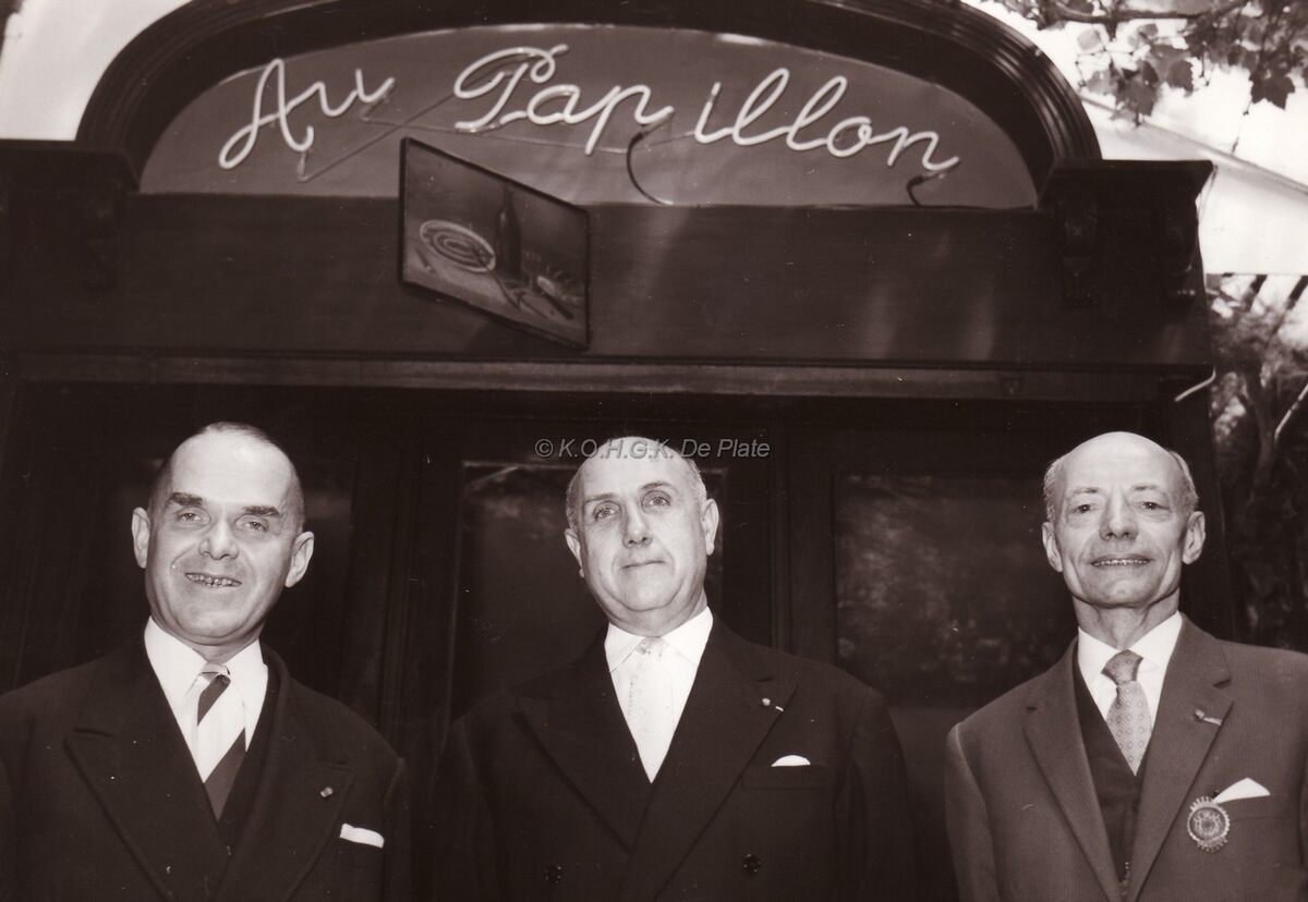 De burgemeester van Monaco, de heer BOISSON tussen burgemeester Adolf VAN GLABBEKE (links) en Marie-Jozef PORTA, consul van Monaco en schepen voor de ingang van restaurant "Au Papillon" te Oostende bij de jumelage Oostende-Monaco.