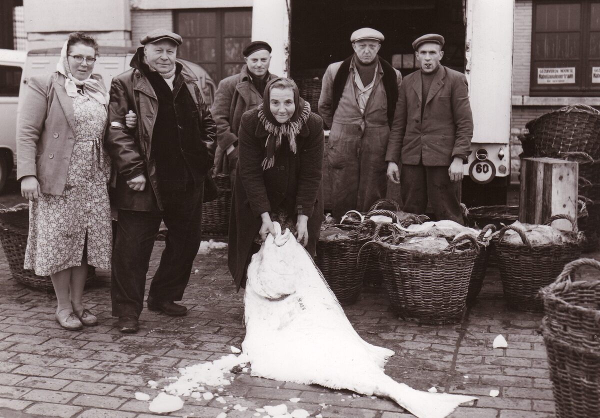 Formaat : 13 x 18 cm. - Links vishandelaar Staes met echtgenote en anderen tonen fier een grote heilbot.