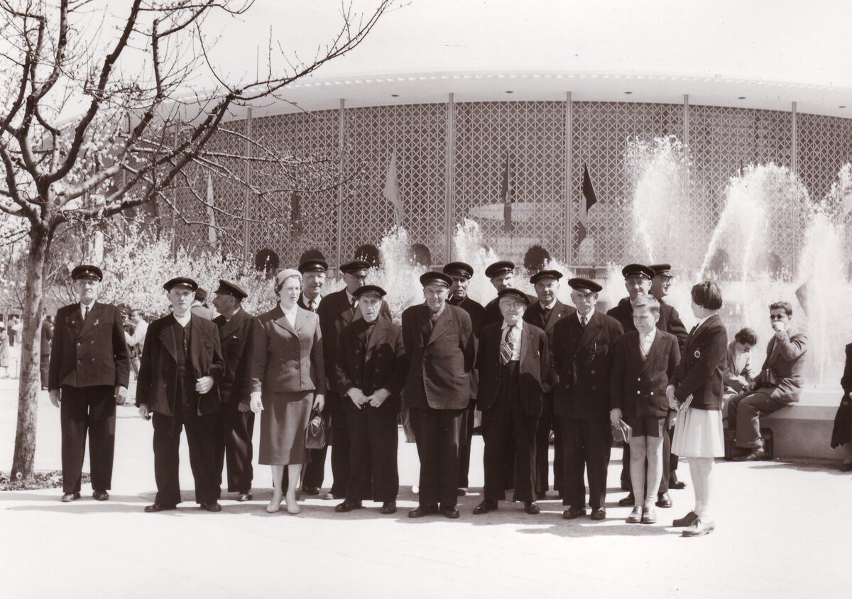 Formaat : 13 x 18 cm. - Een groep bewoners van Godtschalck en hun directrice op bezoek op de Wereldtentoonstelling 1958.