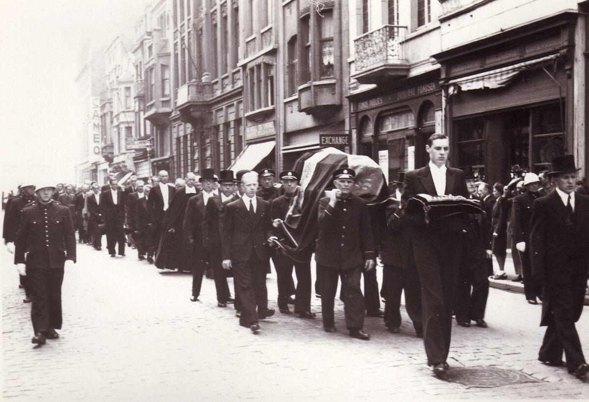 Formaat : 13 x 18 cm. - Begrafenis van Robert Elleboudt, uitgever van de Zeewacht. De stoet in het begin van de Kapellestraat met vooraan een piepjonge Jan Piers, de latere burgemeester en rechts van hem begrafenisondernemer Willy Lucas. Opmerking : de kist wordt gedragen. Achteraan rechts Cinema Cameo.