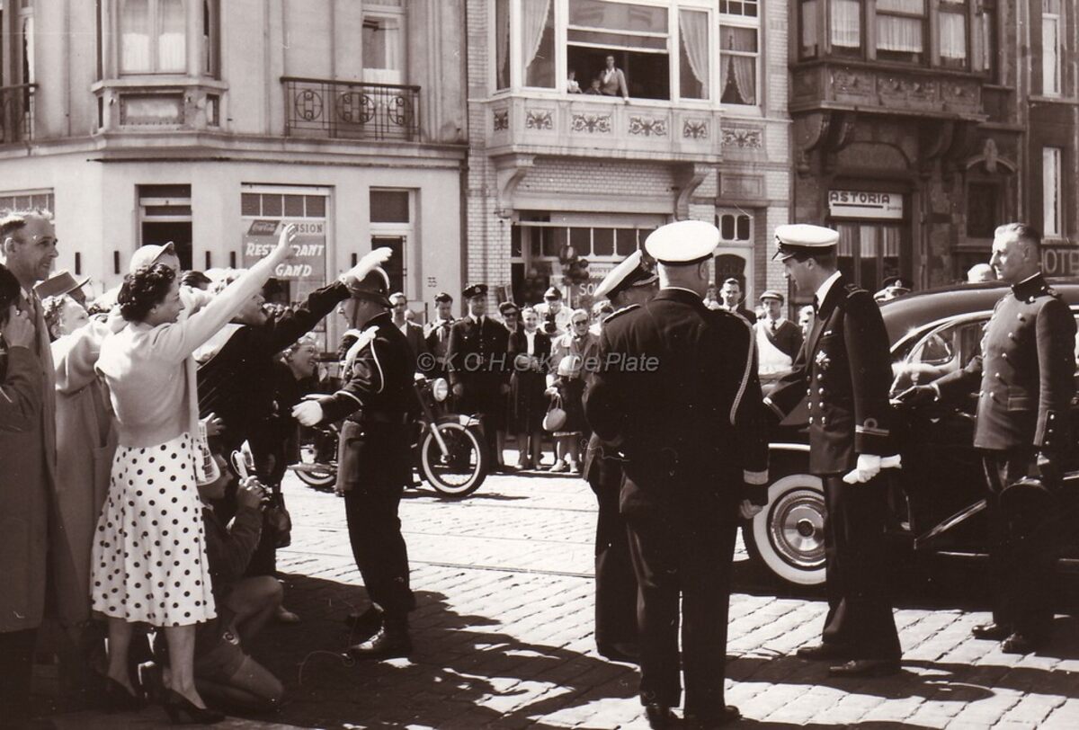 Prins Albert op bezoek. Hij wordt begroet op de hoek Hofstraat met Albert I-Promenade